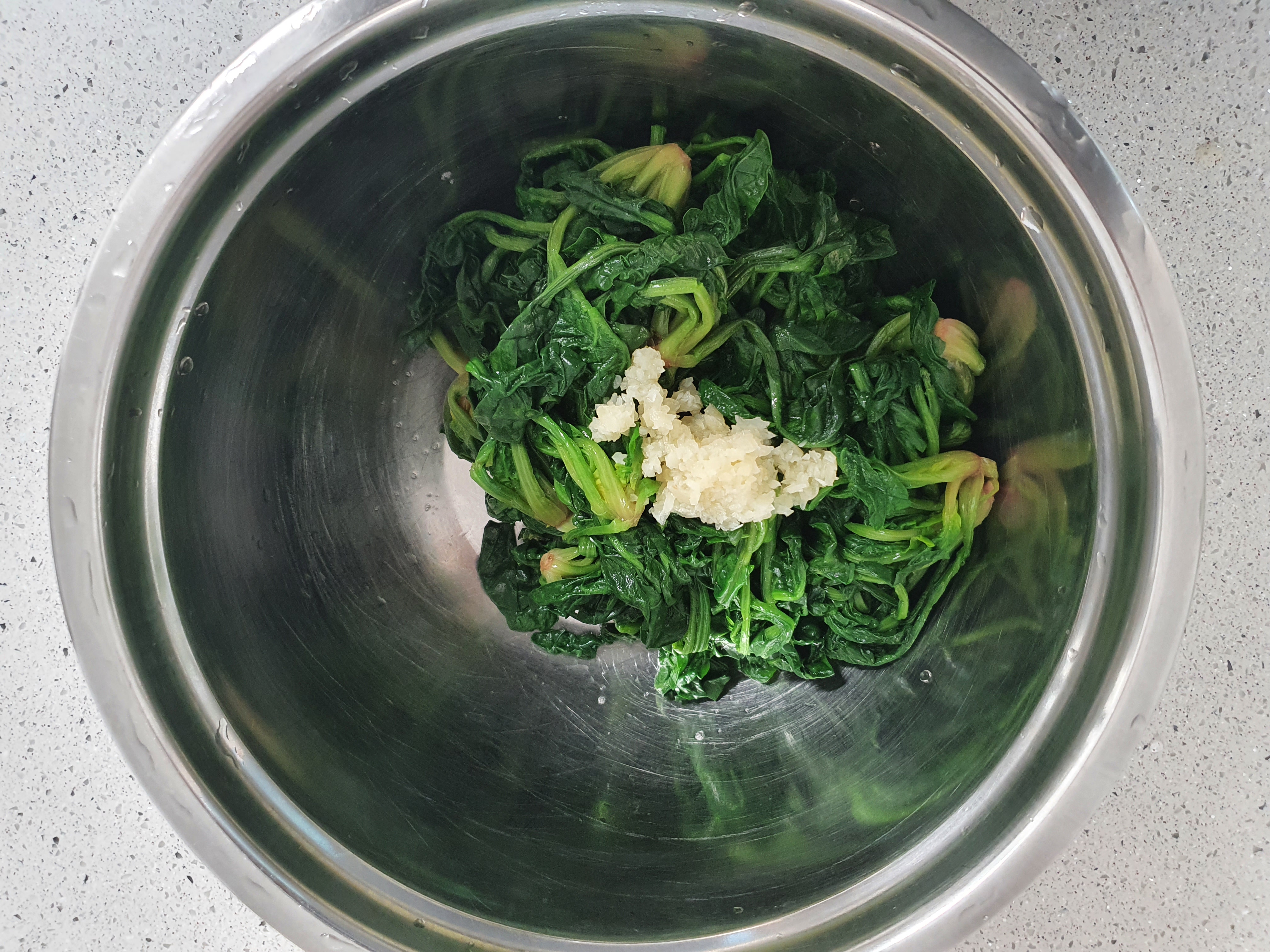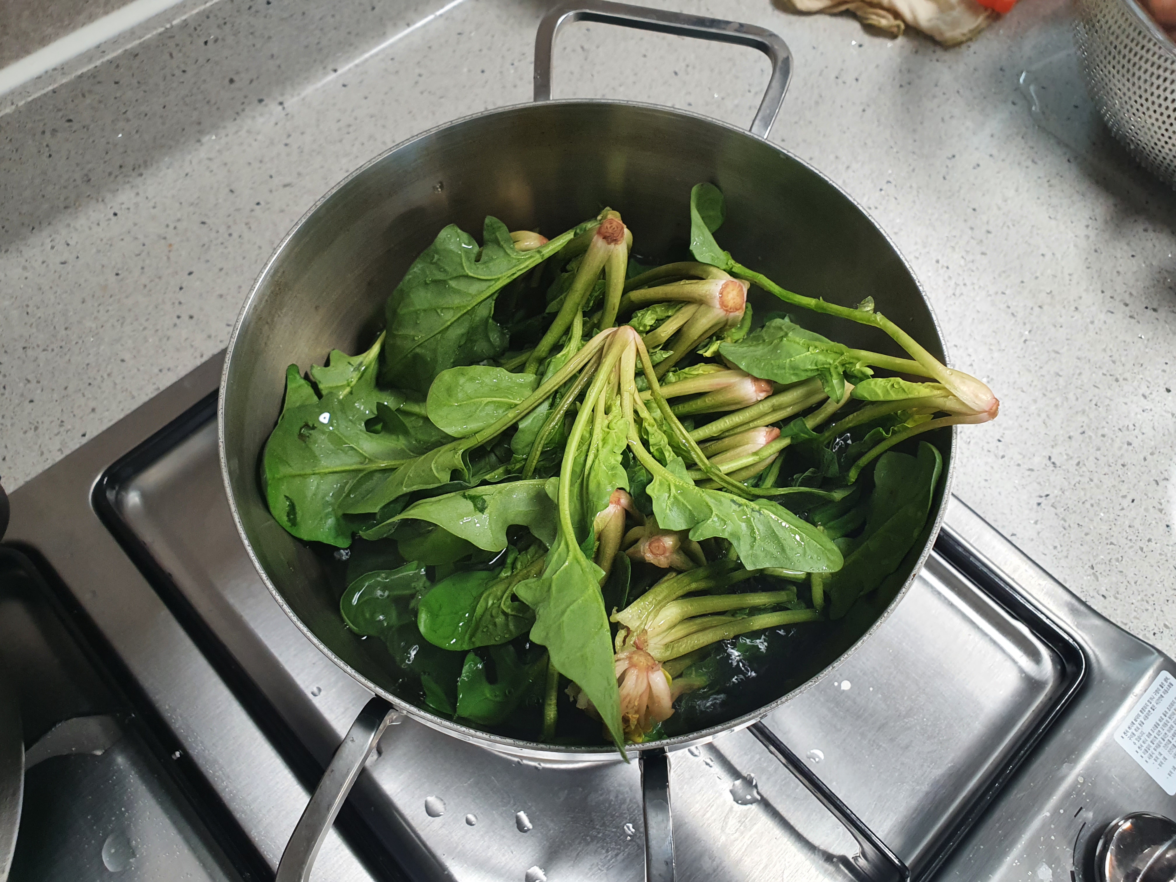 엄청 많아 보이는데 누르면 다 들어갑니다. 삶으면 부피가 많이 줄어듭니다. 아삭한 시금치를 위해선 정말 살짝 담갔다 빼는 느낌으로 해주셔야 합니다. 시금치를 넣고 담갔다 빼는 느낌으로 해줘야 합니다.