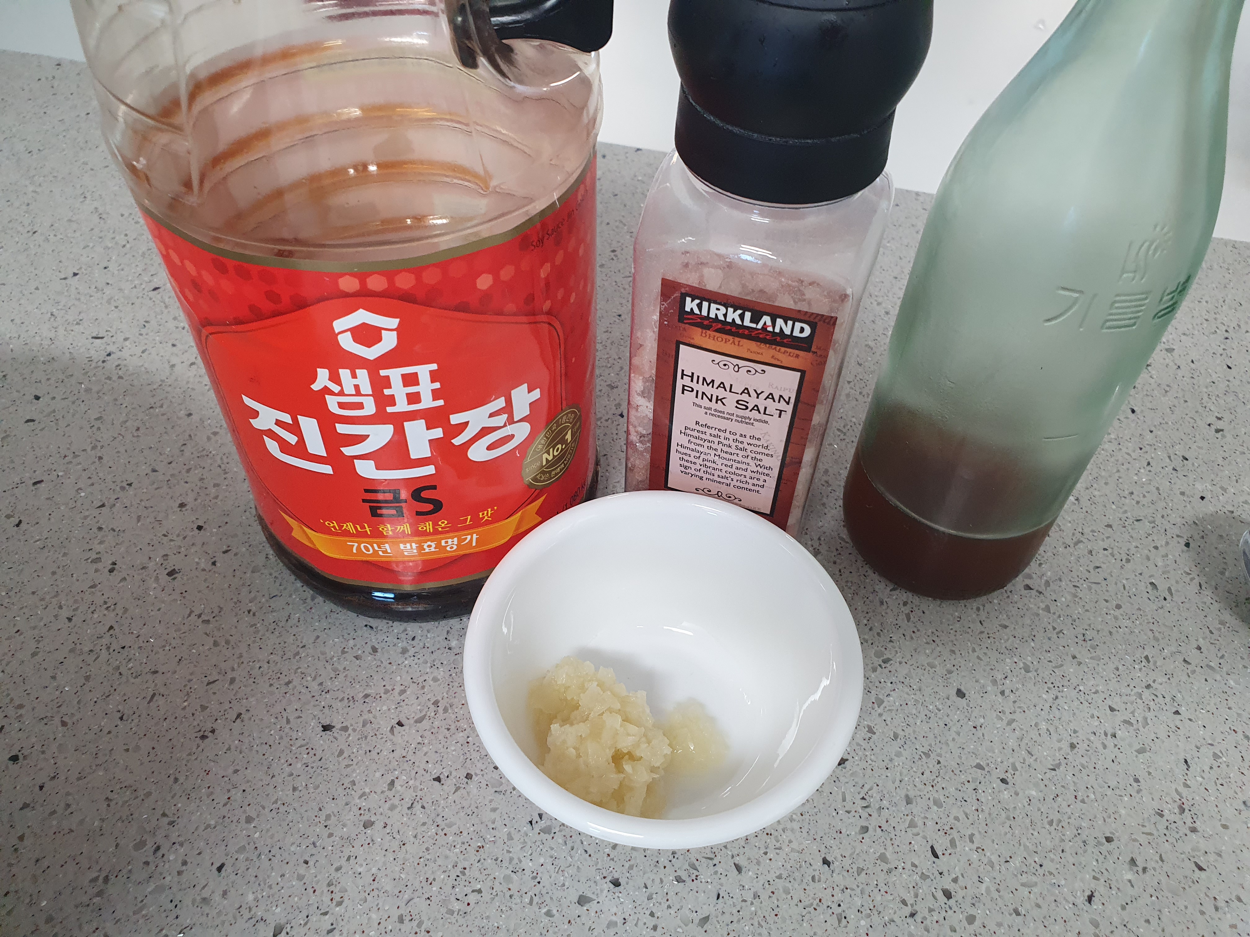 진간장, 소금, 참기름을 준비합니다. 아이랑 먹을거면 간 마늘을 물에 헹궈주면 알싸한 맛이 줄어듭니다.
