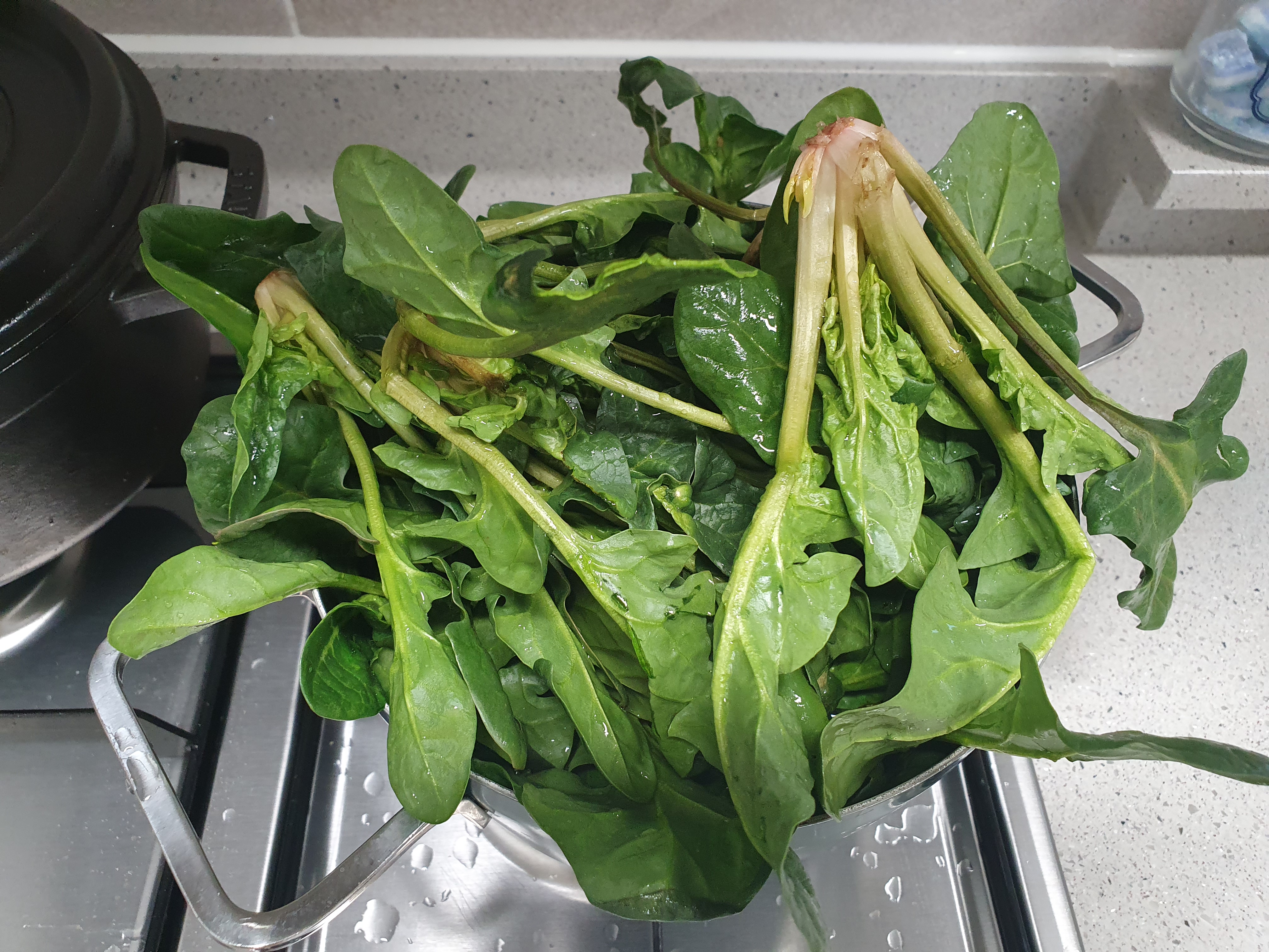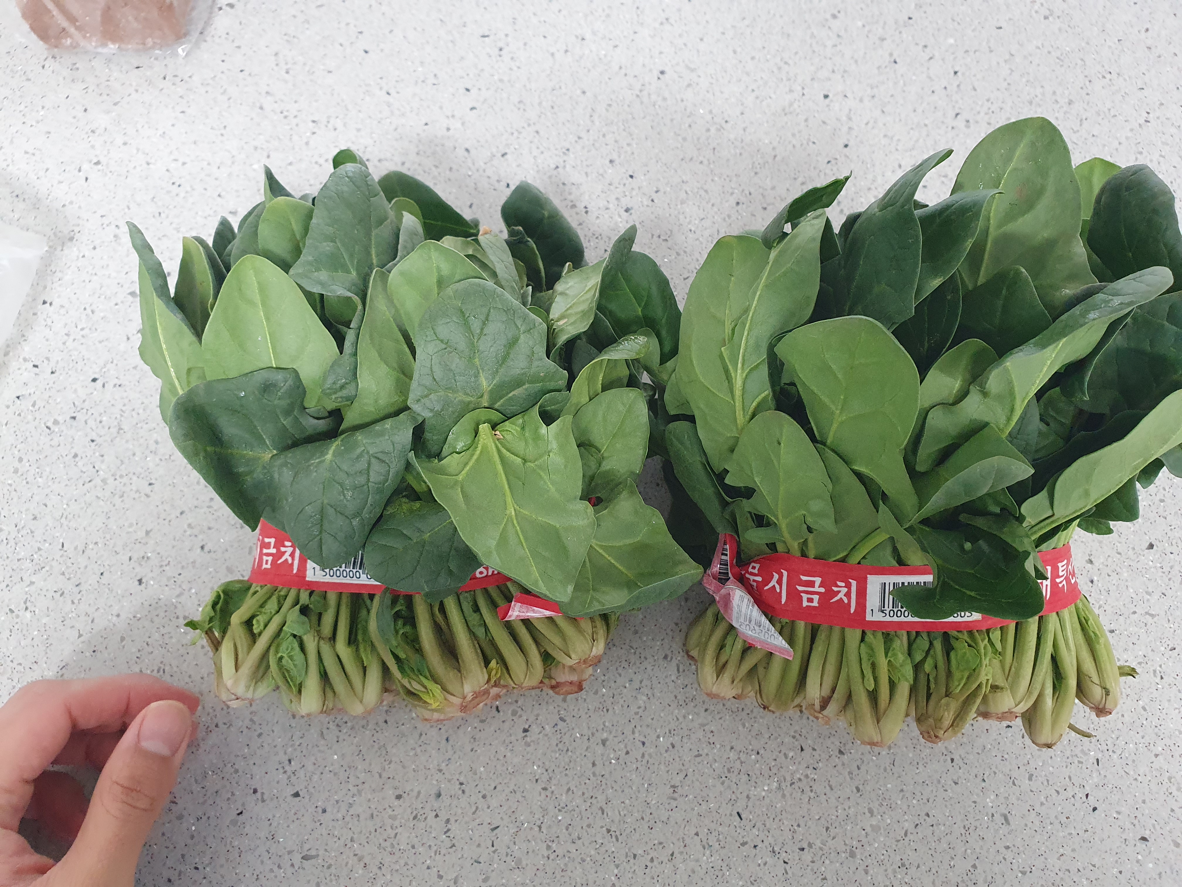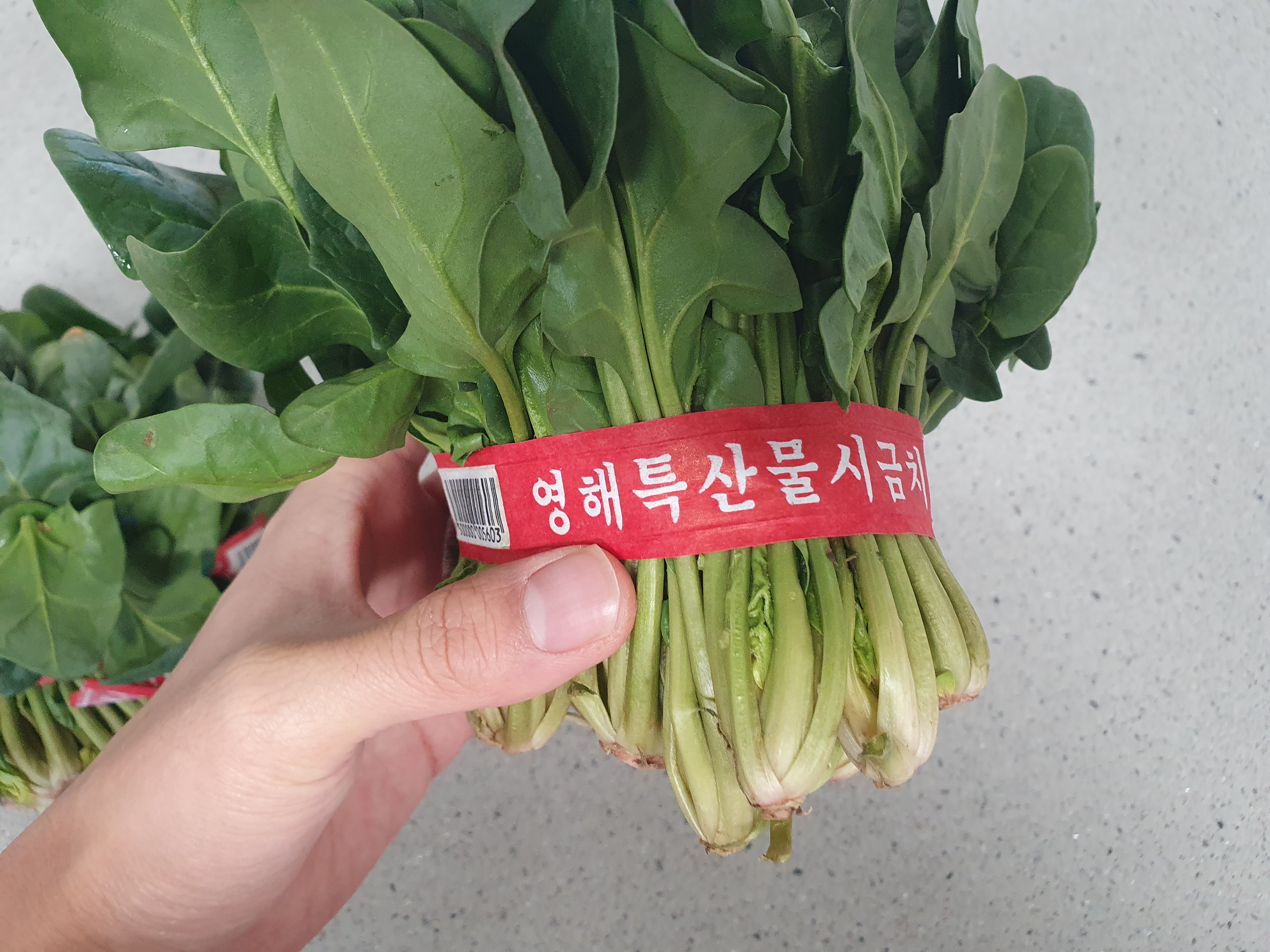 영해 특산물 시금치라고 합니다. 시금치를 데치면 부피가 엄청 줄어들기 때문에 한단은 두고 먹기 부족하고 두 단은 사야 냉장고에 두고 먹을 수 있습니다. 이번 시금치는 뿌리가 제거되어 나온 것이어서 간단히 씻기만 합니다.