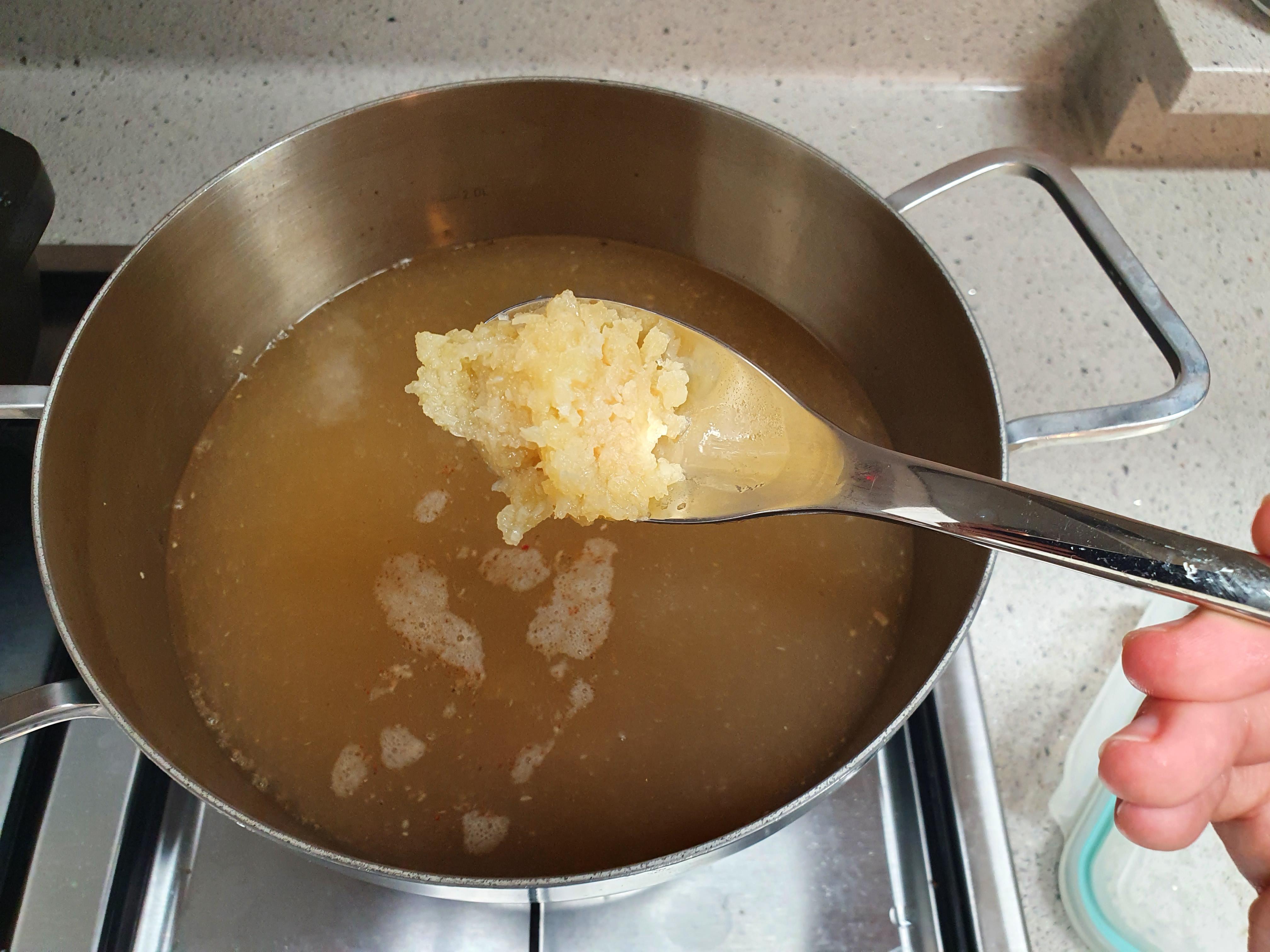 물 1.5L에 다담 된장을 크게 한 스푼 풀어줍니다. 다담 된장은 아이가 먹기엔 조금 맵기 때문에 한 스푼만 넣어줍니다.