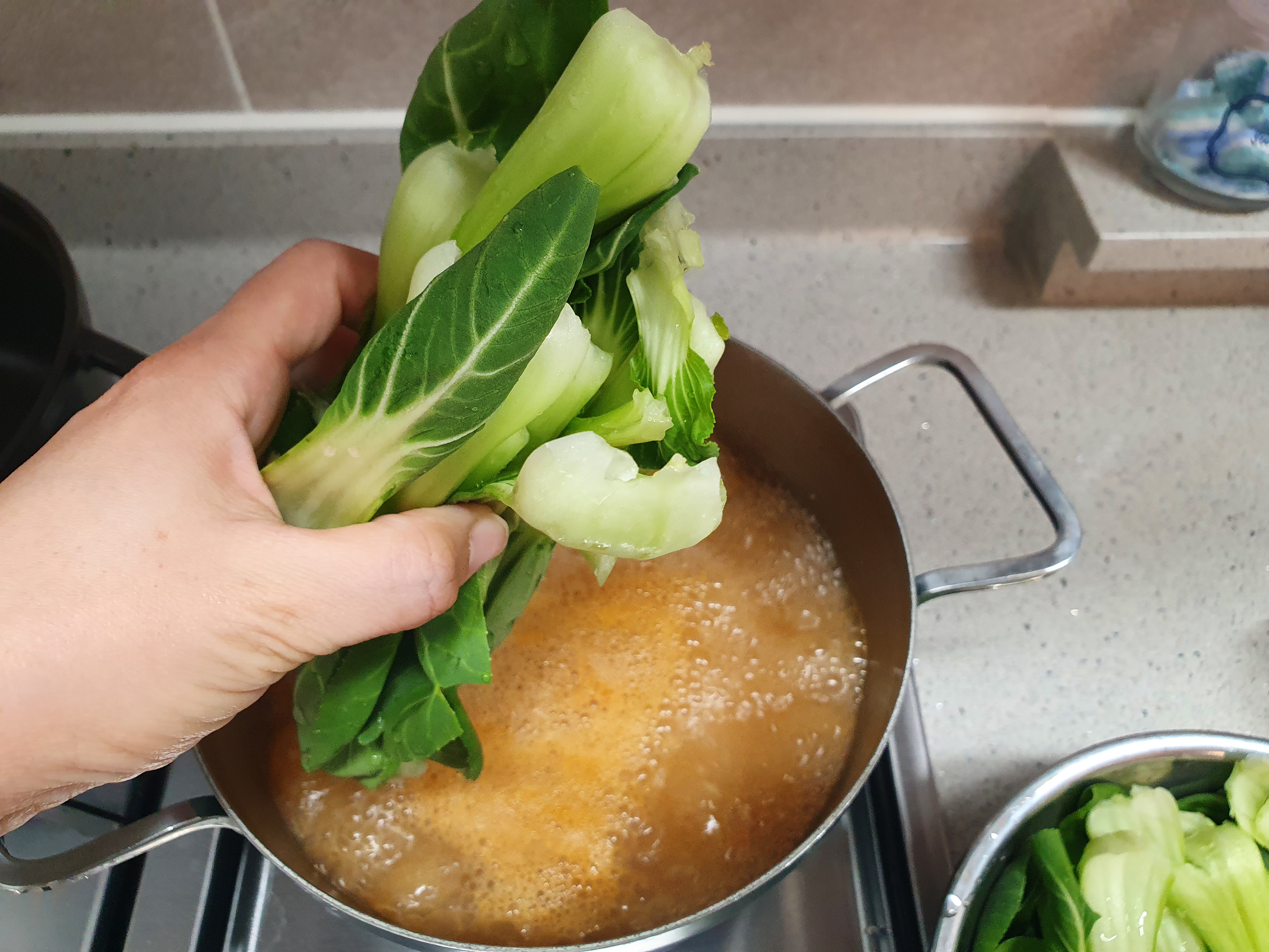 된장국이 한소끔 끓으면 청경채를 넣어주고,