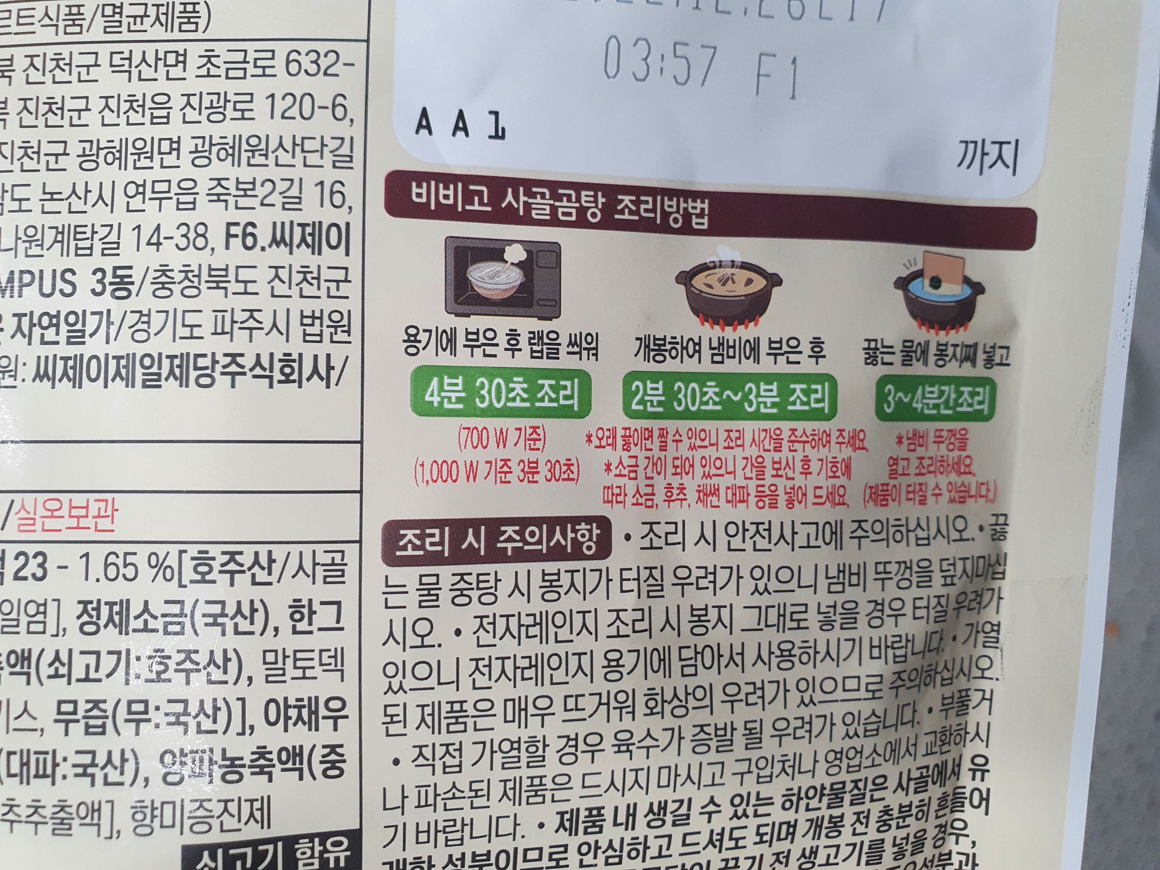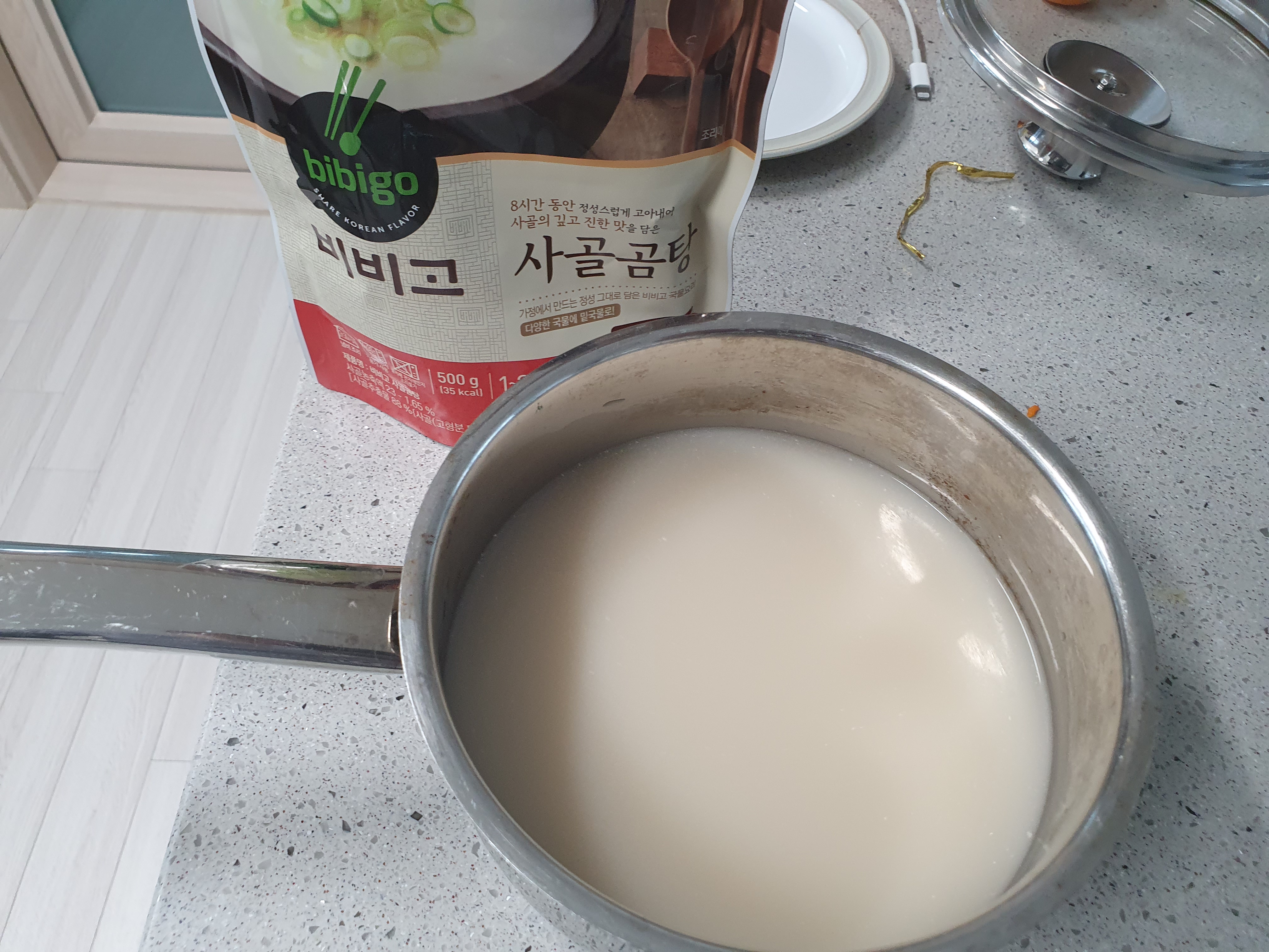 개봉하여 냄비에 부은 후 끓일 예정입니다. 이 사골곰탕은 이미 간이 되어있어 따로 소금간이 필요 없습니다.