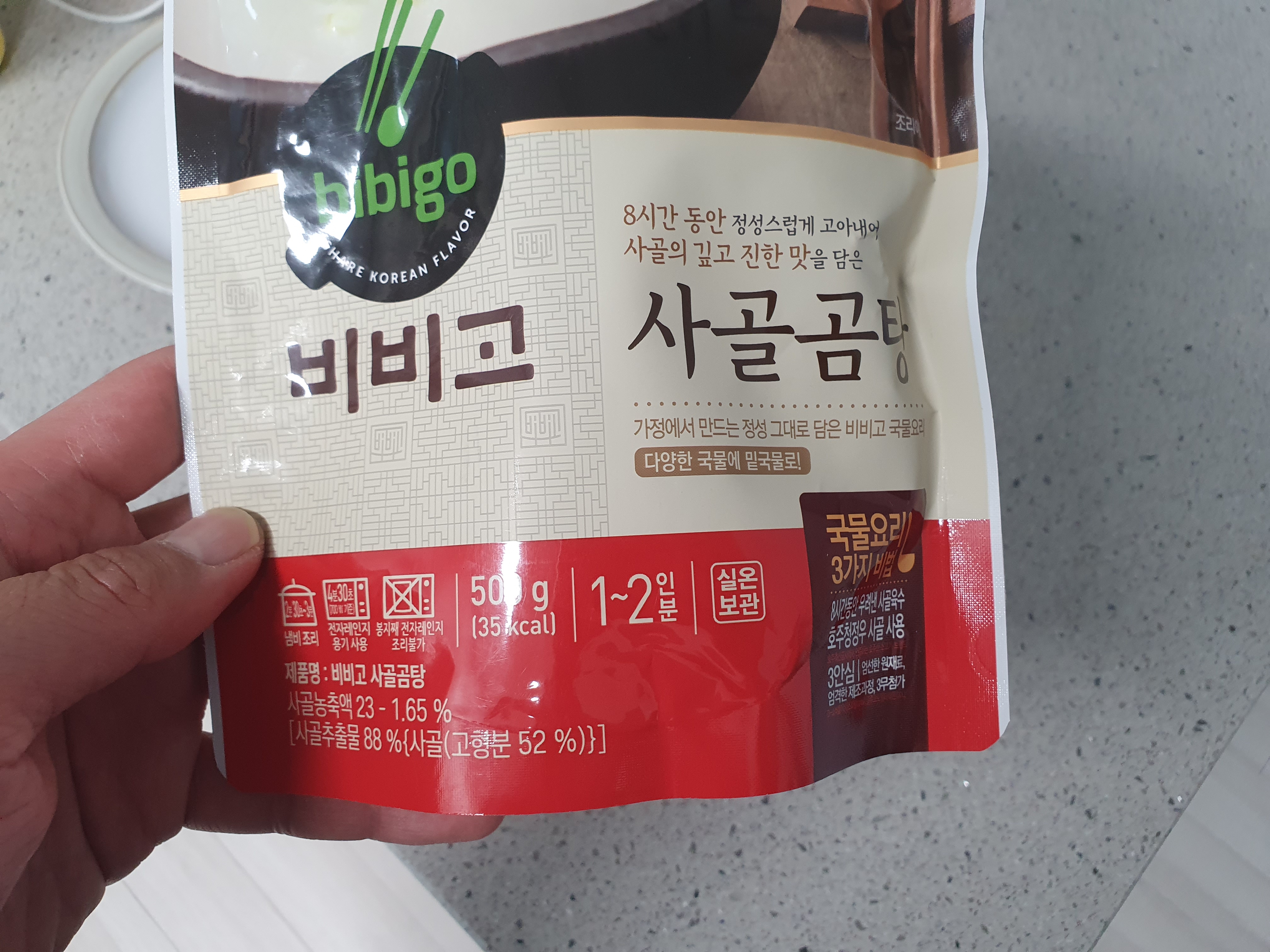 만두국이 먹고 싶을 때 집에서 가장 빠르게 먹는 방법은 레트로 식품을 이용하는 것입니다. 지난 설에 사두었던 비비고 사골 곰탕을 꺼내봅니다. 딱 2인분 나오는 것 같습니다.