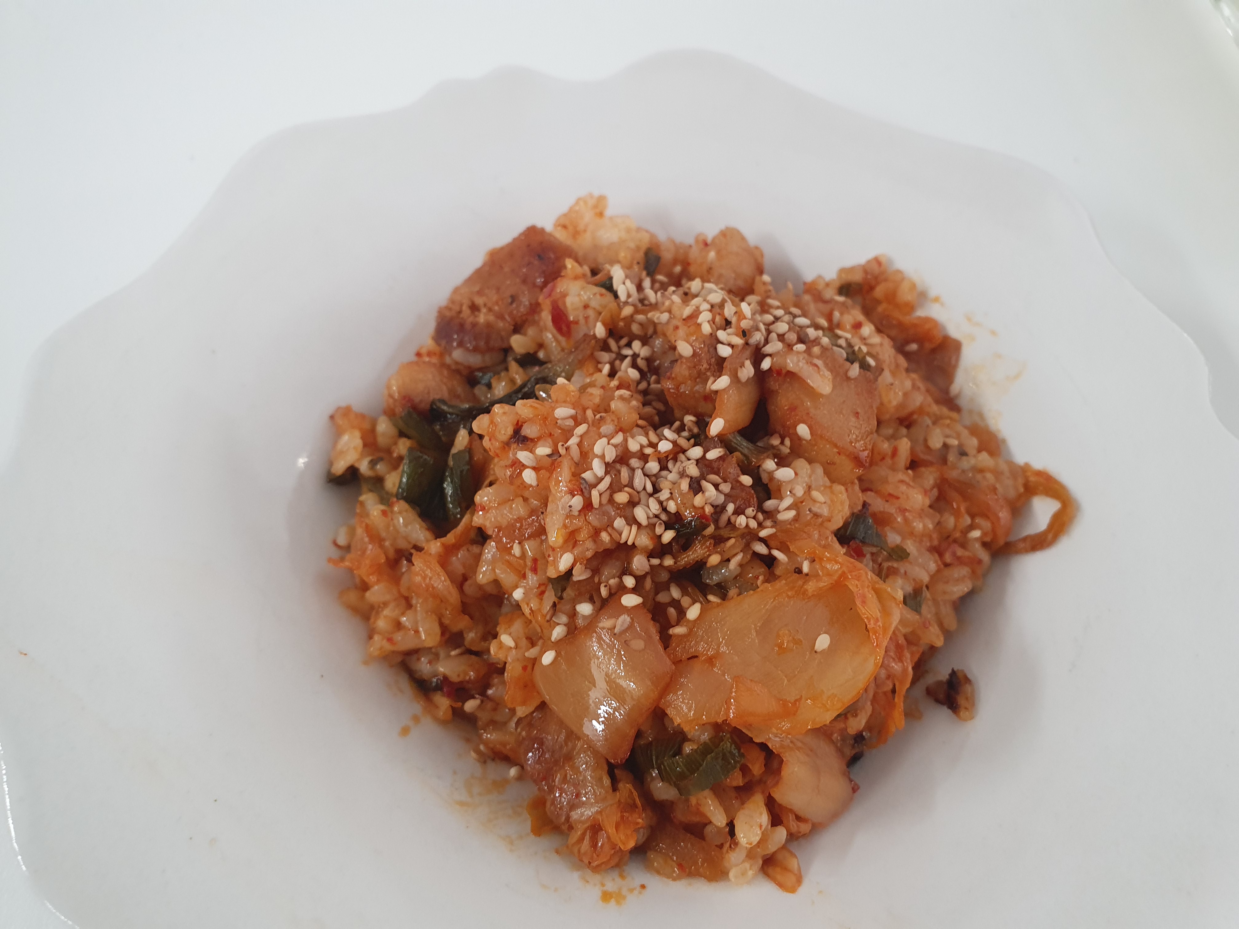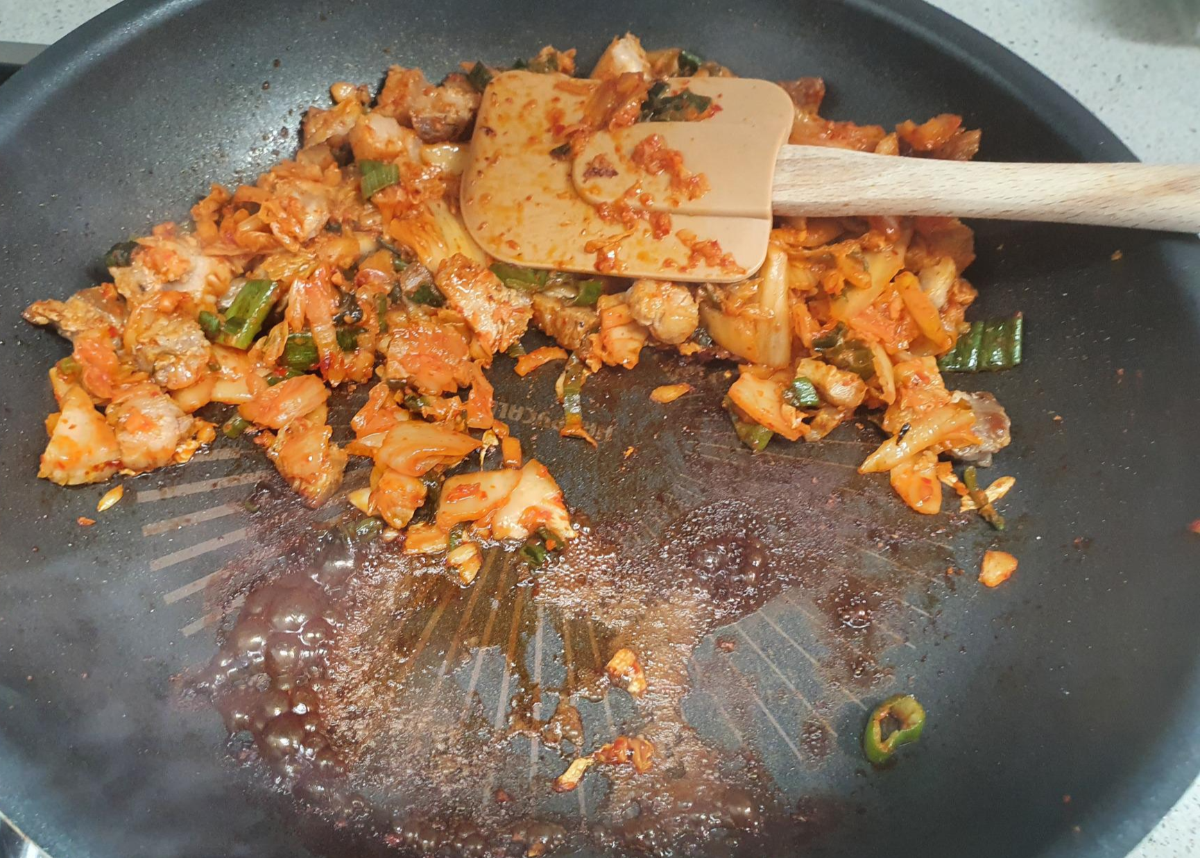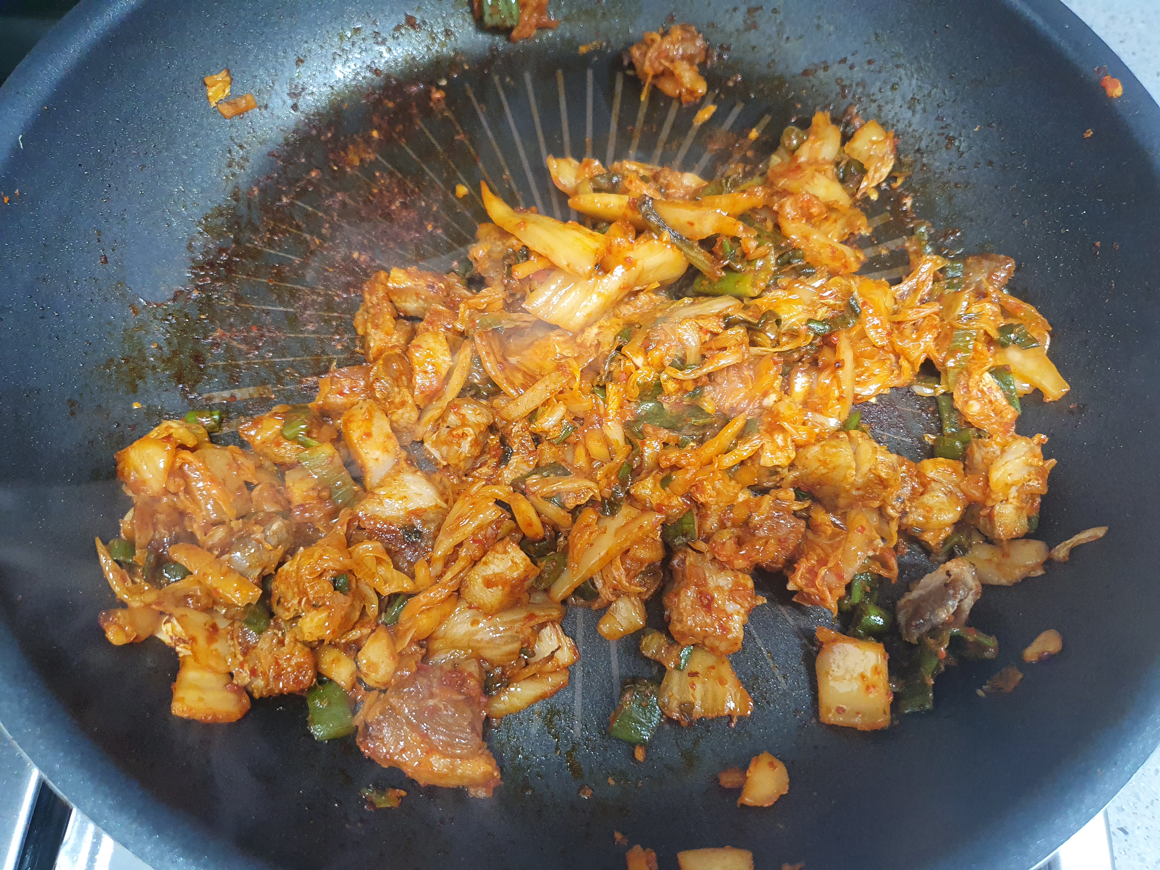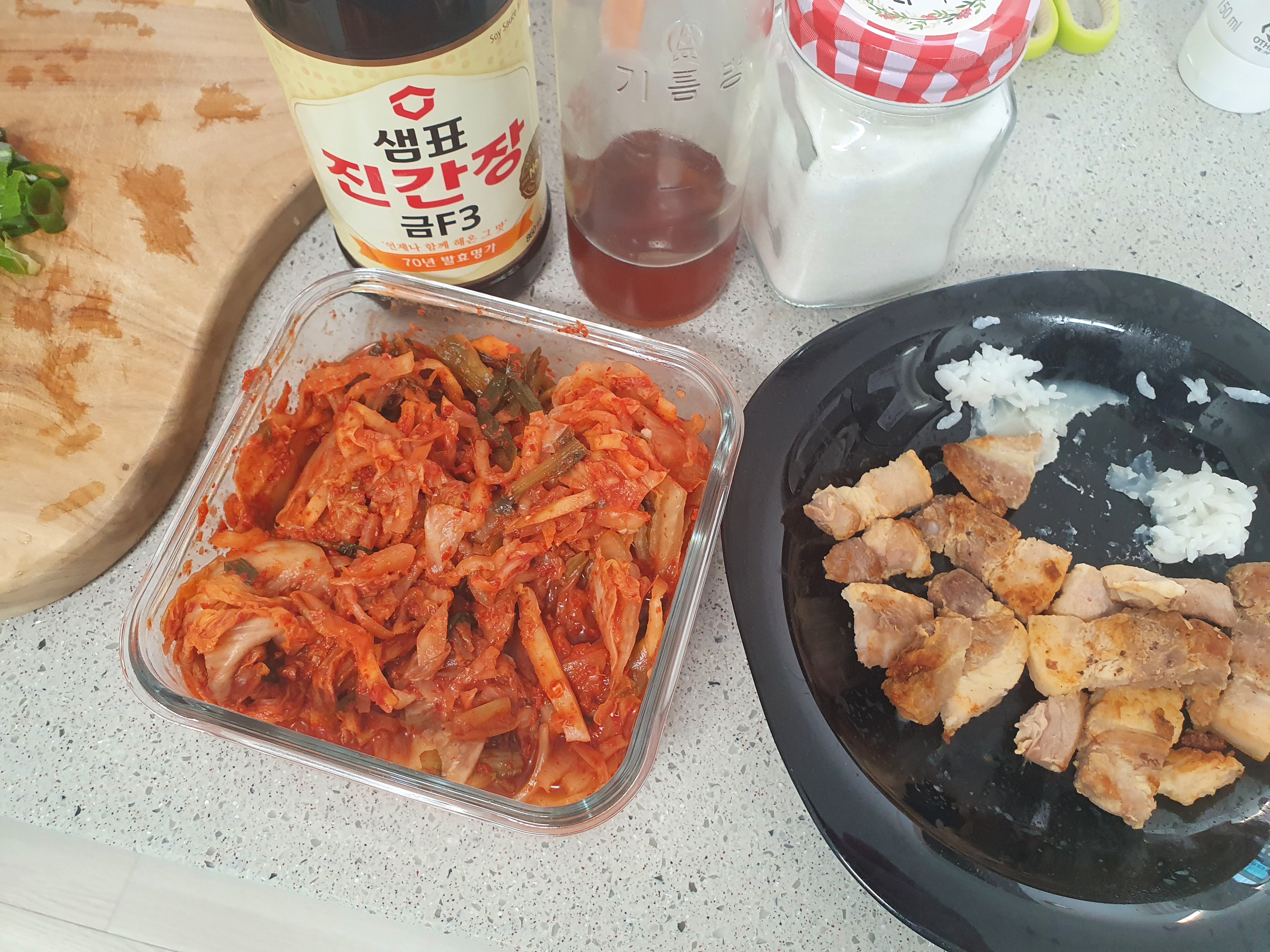 레시피: 대파, 김치, 삼겹살, 설탕(반 스푼), 간장 (한 스푼), 마늘, 참기름