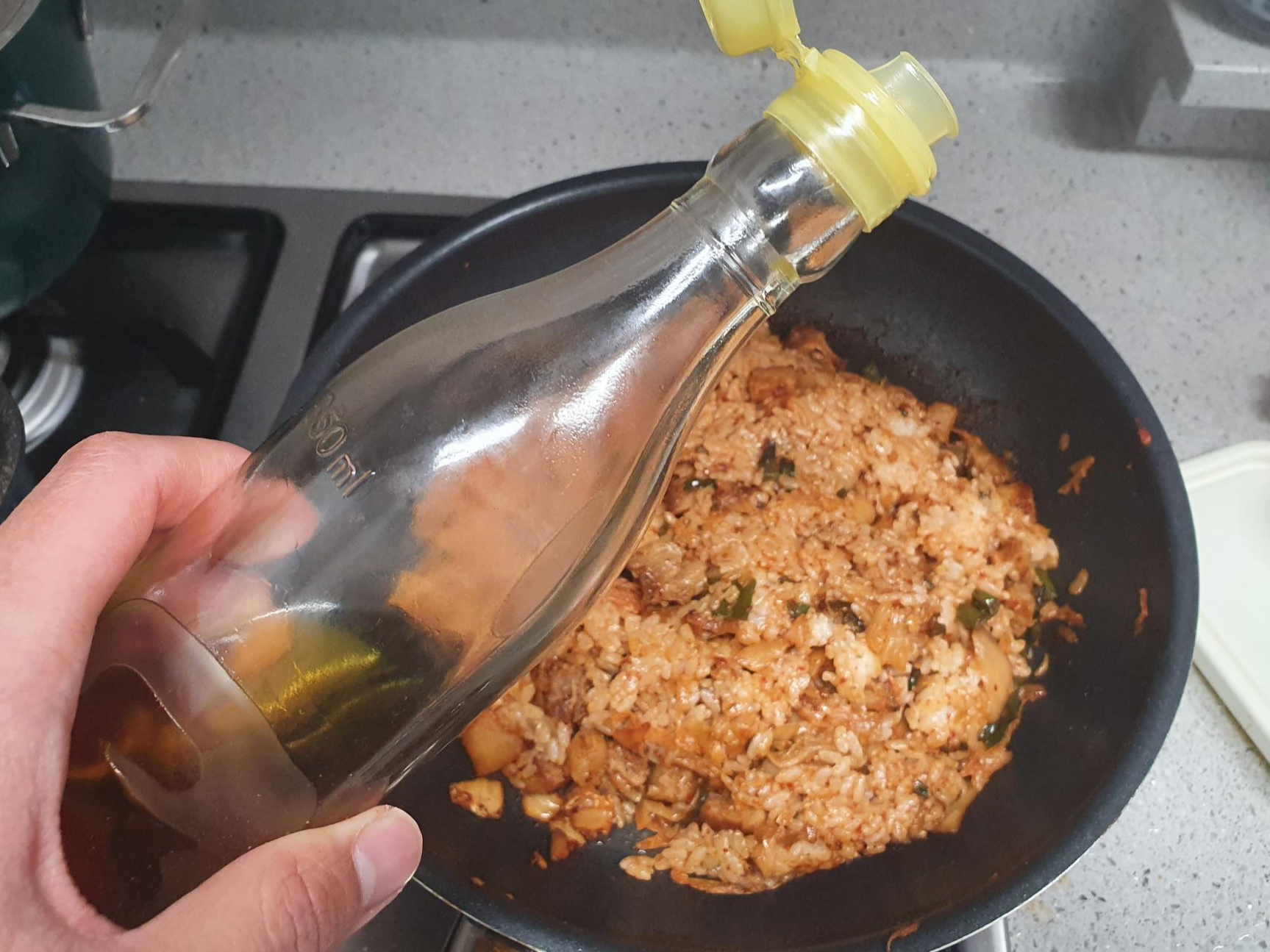 간장을 재료에다가 뿌리는 게 아니라 달궈진 프라이팬에 넣어줍니다. 그러면 불맛이 추가됩니다. 이 미묘한 차이가 볶음밥의 맛을 업그레이드시켜줍니다.