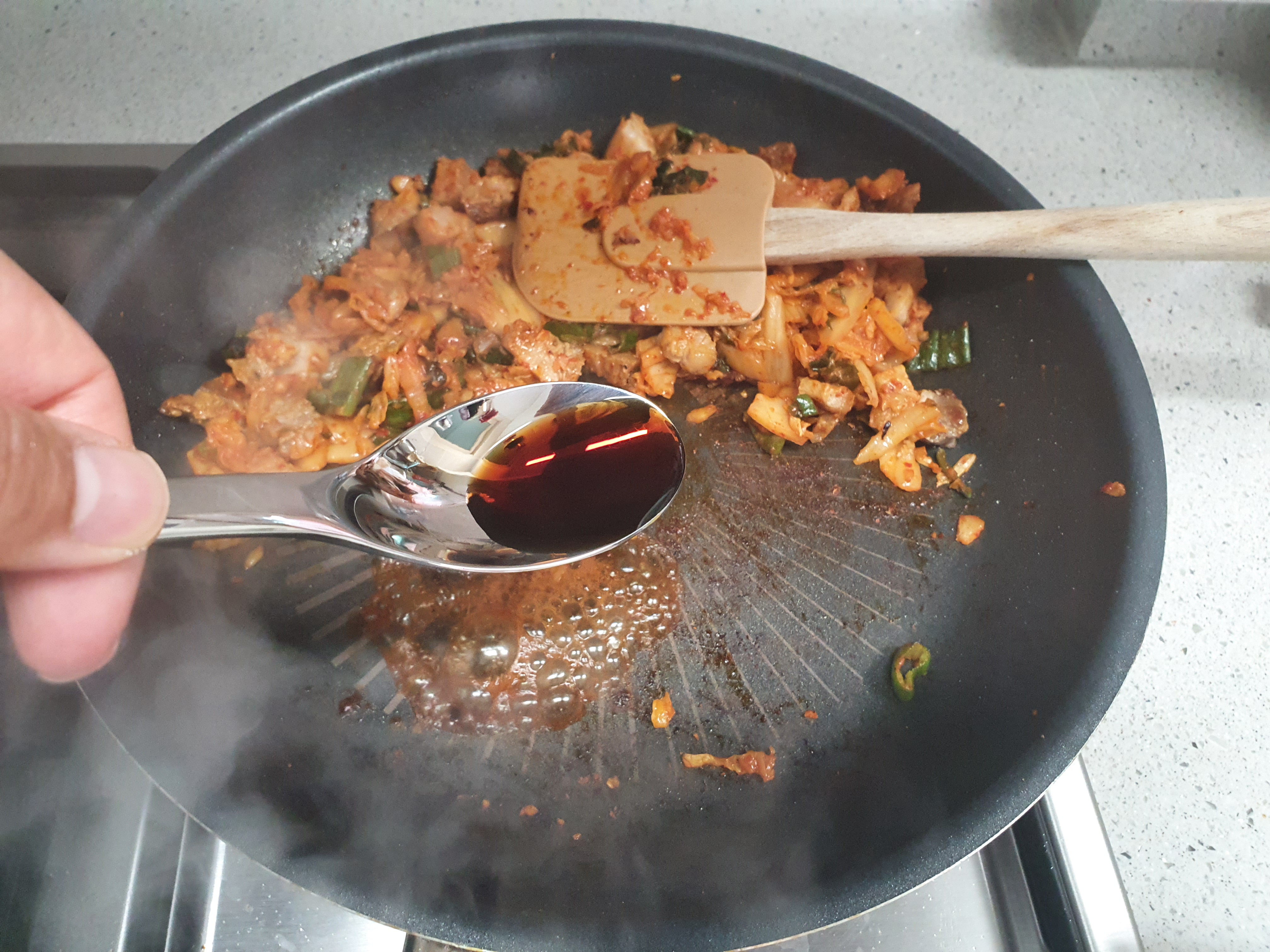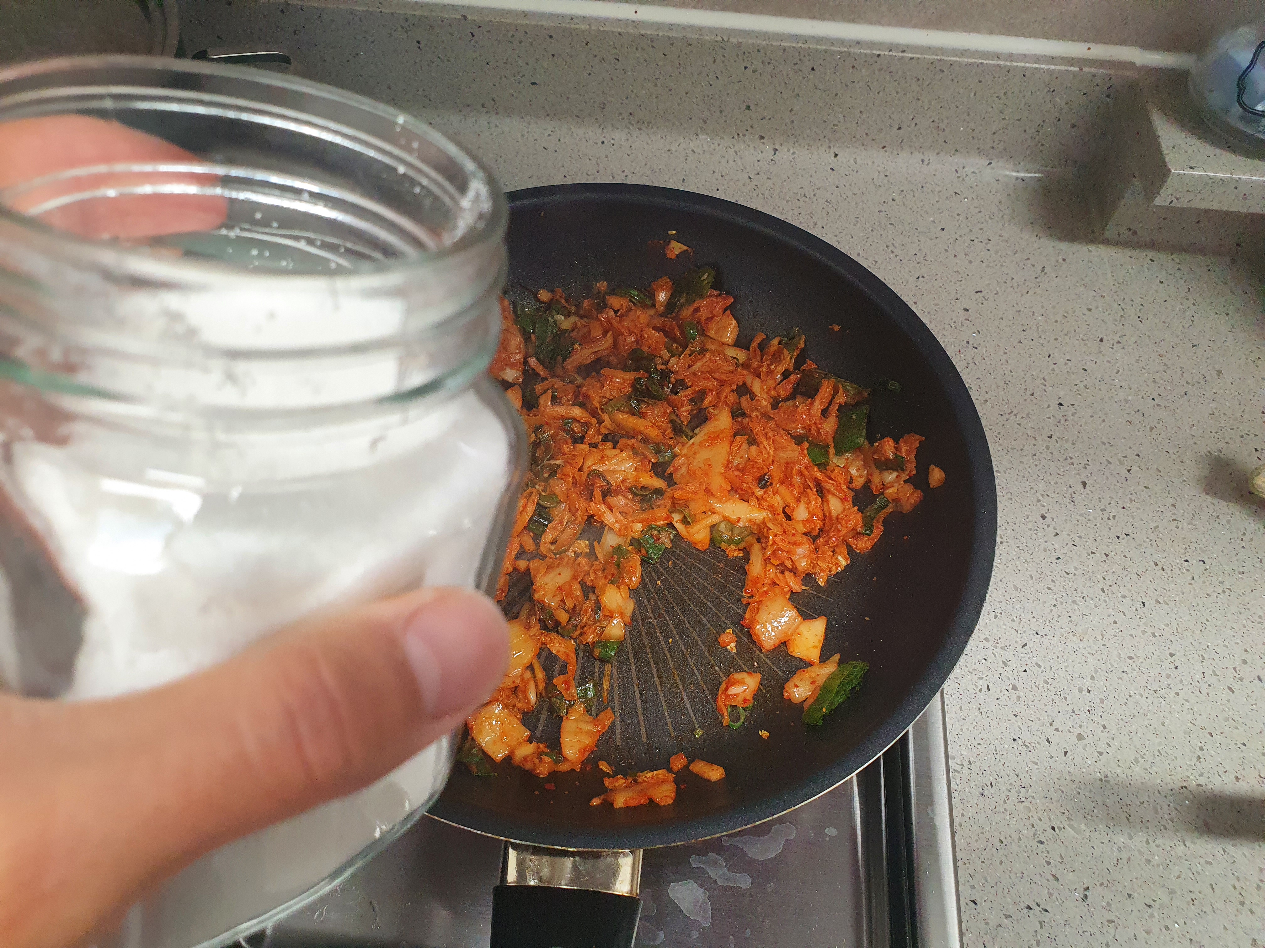 김치가 너무 쉬면 설탕을 넣어주면 그 맛이 조금 잡힙니다. 설탕을 한 스푼 둘러줍니다.