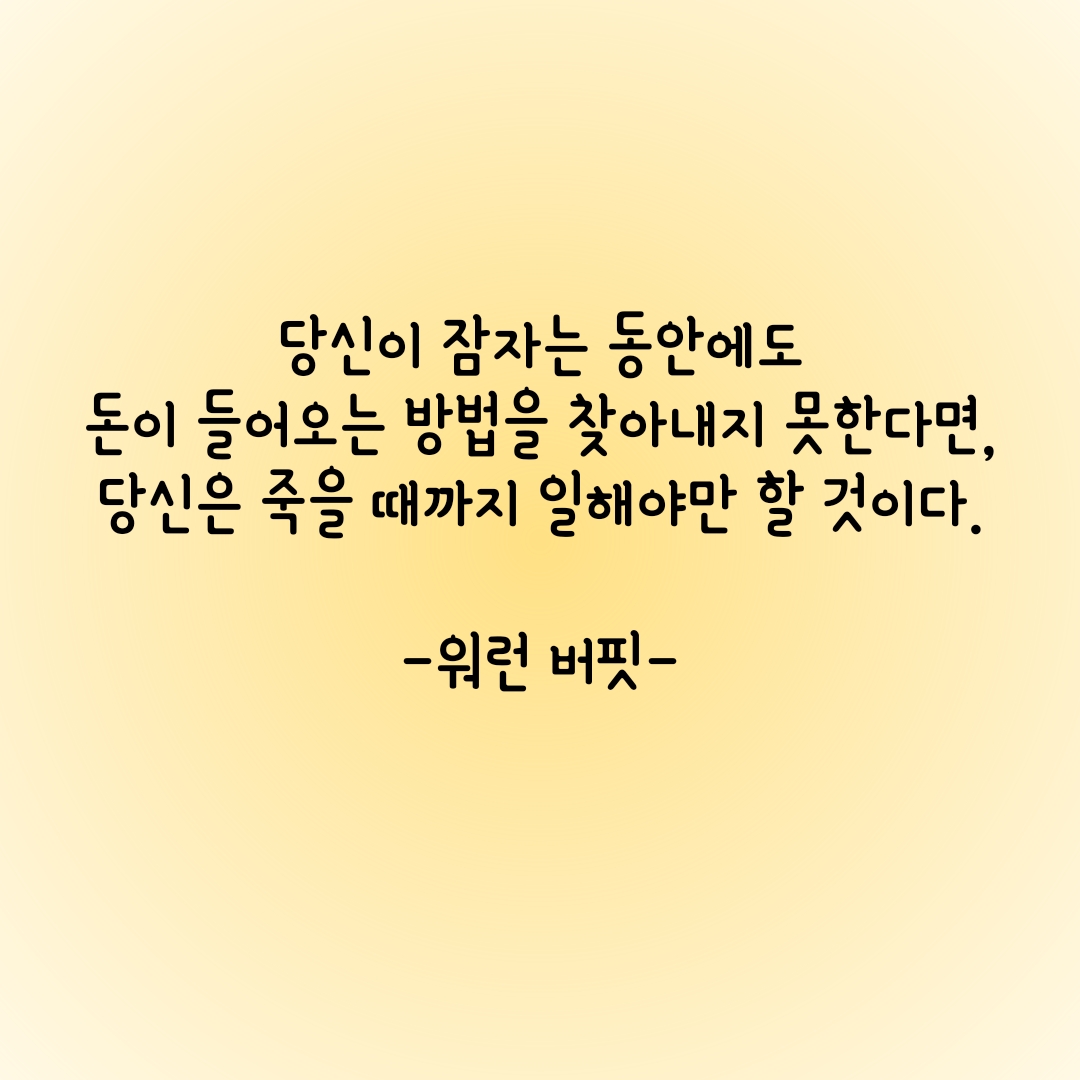 당신이 잠자는 동안에도 돈이 들어오는 방버을 찾아내지 못한다면, 당신은 죽을때까지 일해야만 할 것이다. 다양한 파이프라인을 만들어야하는이유가 이거다. 죽을때까지 내가 좋아하는 나의 일을 할 수 있는 시스템을 만들자. 남을 위해 평생 일하진 말자!