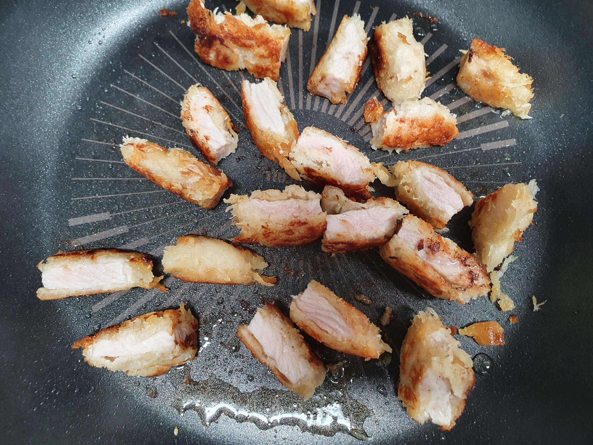 생각보다 엄청 바삭한 돈까스가 됩니다. 그리고 중간에 절대 기름을 추가하지 않습니다. 잘못 추가했다가 튀김이 기름을 먹어 기름 쩐 맛이 나기 때문입니다.